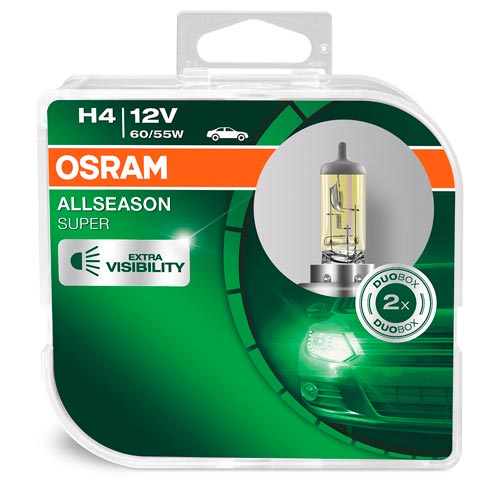 Лампы головного освещения Osram Allseason Super H4 в отличие от штатных ламп демонстрируют, во-первых, большую яркость (в два раза больше света), обеспечивая водителю комфортное вождение, освещая дорогу теплым желтым светом, а во-вторых, более длительный срок службы, что вкупе с невысокой стоимостью делают их максимально привлекательными для водителей, которые не хотят тратиться на ксенон или светодиоды, которые хоть и показывают куда лучший результат в плане освещения дороги, но, к сожалению, нередко имеют высокую цену.